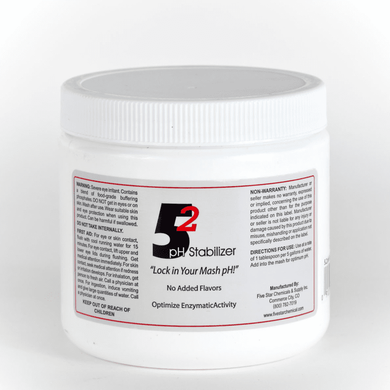 ¡Nunca más te preocupes por el pH! Una cucharada de 5.2 por lote de 20L y su agua se ajusta instantáneamente al pH perfecto de 5.2, sin importar cuál fue su pH inicial. No agregará ningún sabor a su agua de maceración en absoluto. 5.2 optimiza la actividad enzimática de su malta, ayuda a aclarar el mosto e incluso puede ayudar a aumentar las gravedades iniciales. Además, usar 5.2 en ebullición le dará un uso del lúpulo más uniforme y también mantendrá las sales de agua dura en solución, lo que reducirá las incrustaciones en sus intercambiadores de calor, fermentadores y barriles. Si está haciendo all-grain, agréguelo al agua de su Macerado: 1 cucharada por lote de 20L, independientemente del volumen de agua del macerado. No es necesario que agregue ningún extra a su tanque de destilado u olla de cocción.