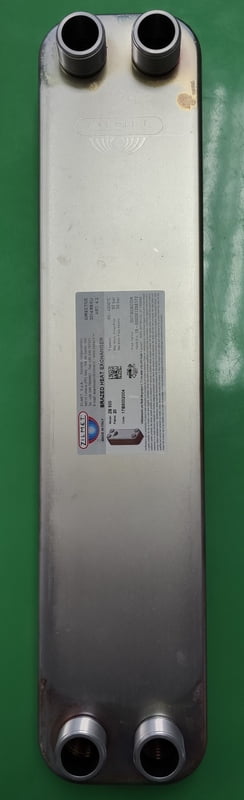 Intercambiador de Calor Fijo Acero Inoxidable 316L Conexion BSP 1" HE 100.000 KCAL Litros que Enfria de 100C a 20C en 30Min :625Lt Largo 53cm Ancho 11.5cm Alto 6cm Placas 20 (A pedido entrega en 48hrs)