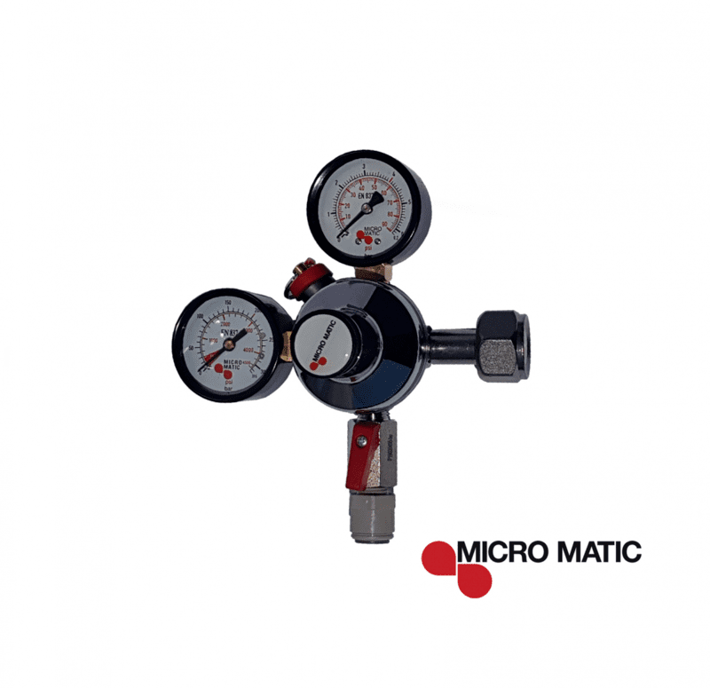 Regulador Co2 Micro Matic 1 salida (Bar, Psi, Kpaskal) 0 - 90 PSI – Incluye manómetros de alta y baja, diseño robusto y atractivo. – Con protección para sobrepresión y ajuste de presión de salida. – Válvula de salida con conector rápido tipo John Guest.