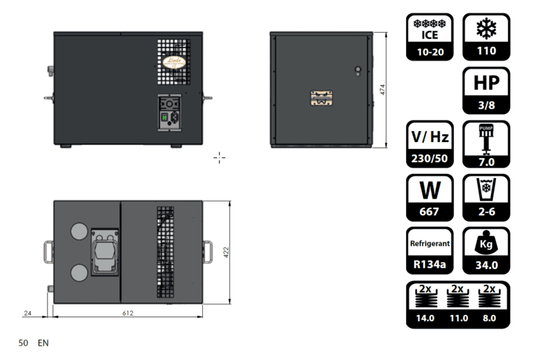 Equipo frio, Lindr, 2 Salidas, made in china, motor 3/8 hp banco hielo 10-20kg, capacidad 110Lt/hora