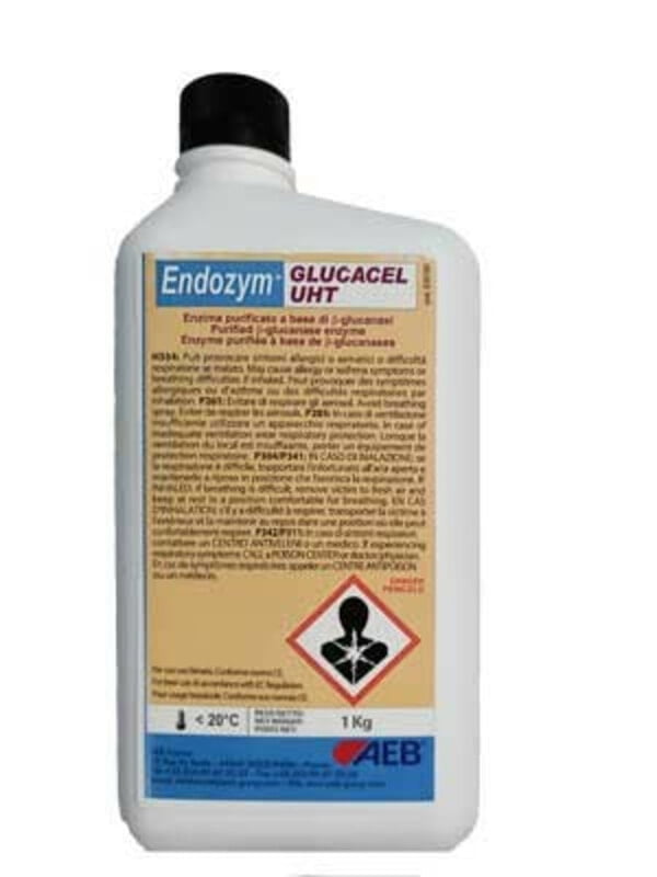 Endozym Glucacel UHT se emplea en la fase de maceraciòn. Reduce la viscosidad del mosto y aumenta la capacidad filtro de la mezcla y la posterior filtraciòn de la cerveza. Las otras actividades secundarias presentes (pentosanasica, arabanasica, celulàsica y xilanasica) permiten aumentar los ciclos de filtraciòn. Mejora la estabilidad de la cerveza terminada. 1Kg o Bidon 25K