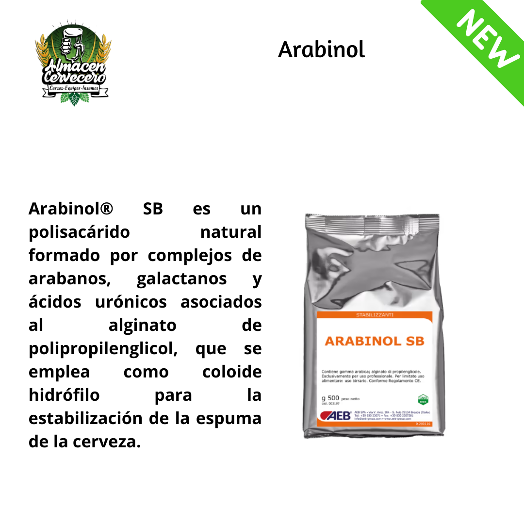 Arabinol® SB es un polisacárido natural formado por complejos de arabanos, galactanos y ácidos urónicos asociados al alginato de polipropilenglicol, que se emplea como coloide hidrófilo para la estabilización de la espuma de la cerveza.