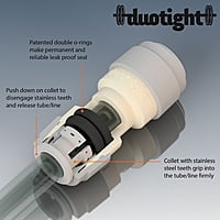 Duotight ofrece una calidad superior en comparación con otros racores instantáneos. Su diseño de junta tórica de EPDM doble proporciona un sello más completo y confiable, protegiendo contra fugas incluso cuando la tubería está doblada en esquinas estrechas. Son adecuados para aplicaciones de bebidas y gas, y tienen una presión nominal de 100 psi. La tubería se puede liberar simplemente empujando el collar y tirando de la línea. ¡Sin necesidad de abrazaderas o líneas de corte!