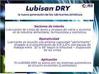 Lubisan Dry es un lubricante líquido sintético de alto rendimiento para cintas transportadoras de envases para líquidos del sector alimentario, cosmético y farmacéutico. Lubisan Dry se utiliza para el transporte de envases de vidrio, PET, aluminio y banda estañada. Se dosifica de forma diluida con intervalos entre una pulverización y la siguiente. Lubisan Dry resulta insensible a la dureza del agua de dilución y permite reducir enormemente el consumo de agua, reduciendo sensiblemente el coste del proceso. Bidon 25LT